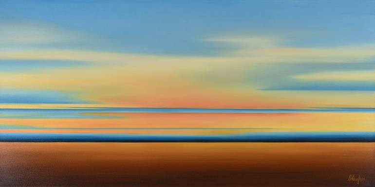 “Golden Sky Glow” is a contemporary abstract landscape oil painting by Suzanne Vaughan. The sky glows a deep rich orange and yellow as the sun illuminates the clouds while setting in a vibrant blue sky. There is a suggestion of distant hills above the land glowing in warm earthy colors. The vibrant ...