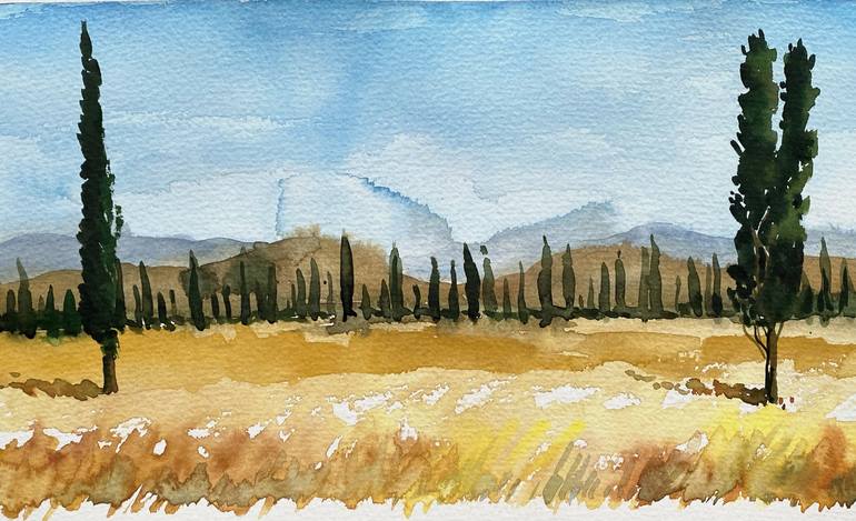 Golden Summer Fields captures the warmth and brilliance of a sunny summer day in the countryside. The painting showcases a sprawling, golden wheat field that stretches toward distant mountains, with rows of slender cypress trees standing tall under the bright sky. Two cypress trees frame the scene i...