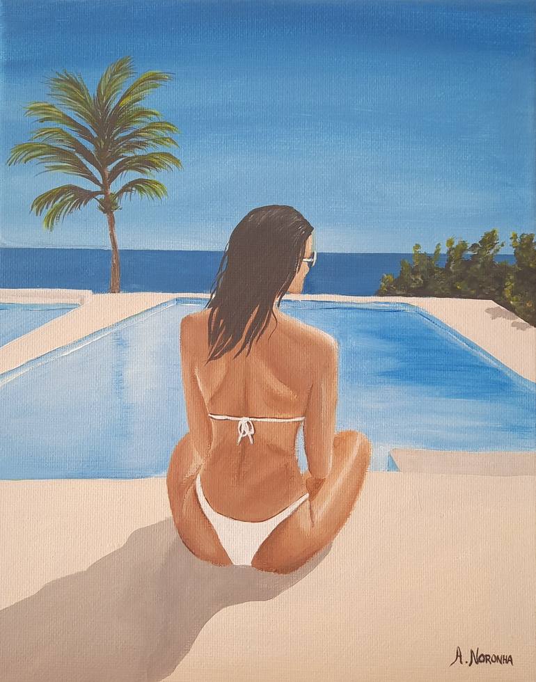 "Golden Summer" captures a moment of pure serenity and warmth. This original acrylic painting portrays a woman seated by a crystal-clear pool, gazing out toward the infinite blue of the sea. It is a visual celebration of sun-drenched days where time slows down, inviting the viewer into a world of re...