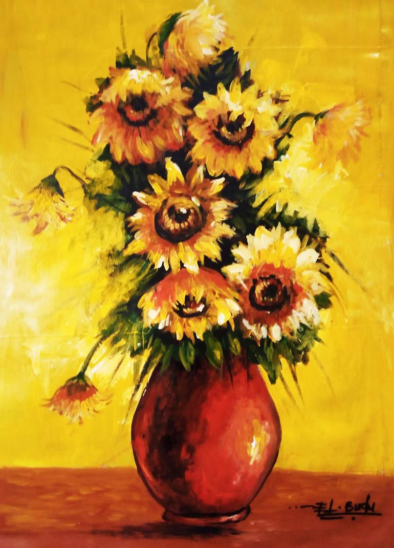 This painting depict a beautiful sun flowers in a traditional pot. Flowers are a sign of love and affection....