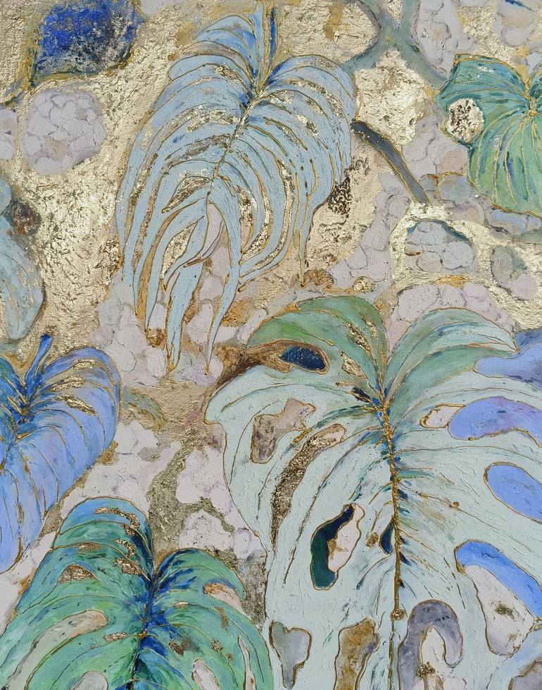 A serene and luxurious portrayal of monstera leaves with soft blue and green hues, accentuated by golden highlights. The textured background and gilded details evoke a sense of elegance and nature’s richness. This piece beautifully captures the timeless charm of tropical foliage with a touch of opul...