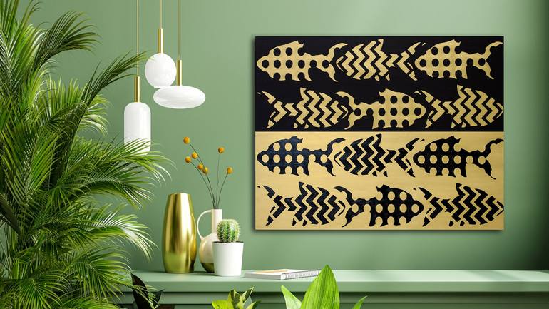 The picture consists of two self-made pictures that can be hung either separately or together. They complement each other remarkably. The paintings are made in a combination of black and gold, it looks strict and elegant. The work was photographed with a digital camera. Colors may differ slightly f...