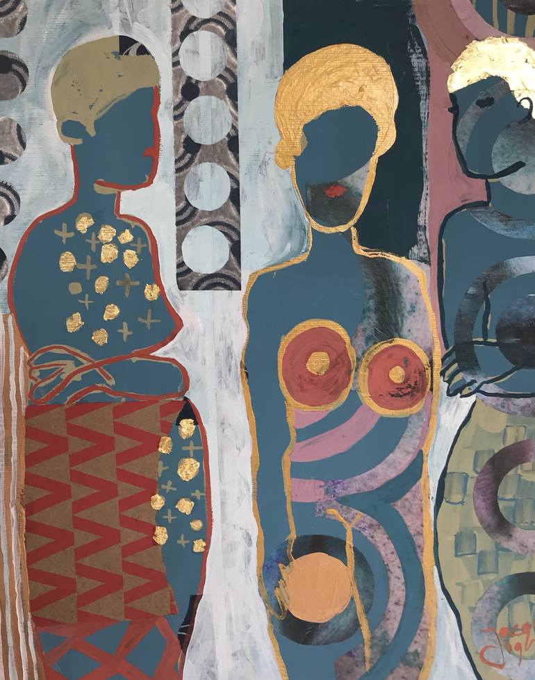I'm interested in the role of women in the world of today. I think we get a better balance in the world if we use the soft power of women. In my paintings I use collage, patterns and color to express this. This drawing is framed, ready to hang.