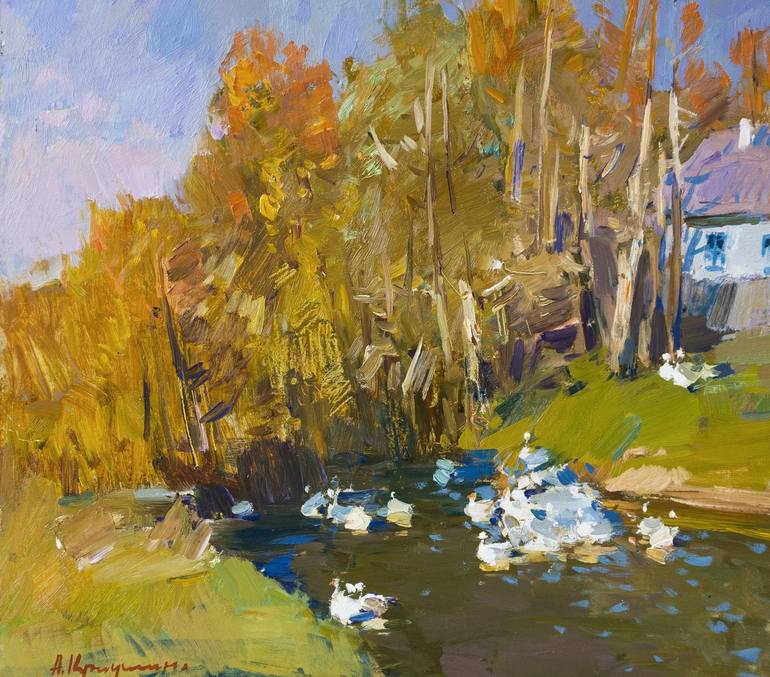 ARTIST: Aleksandr Kryushyn WORK: Original oil Painting, Handmade artwork, One of a Kind MEDIUM: Oil on Вoard YEAR: 2021 TITLE: "Goose Pond" DIMENSIONS: 40 х 45 х 0.3 cm. / 15.5" x 17.5" in. Сreated on Premium Hardboard Panels DESCRIPTION: The sketch was created in the open air in 2021 in the Sumy re...