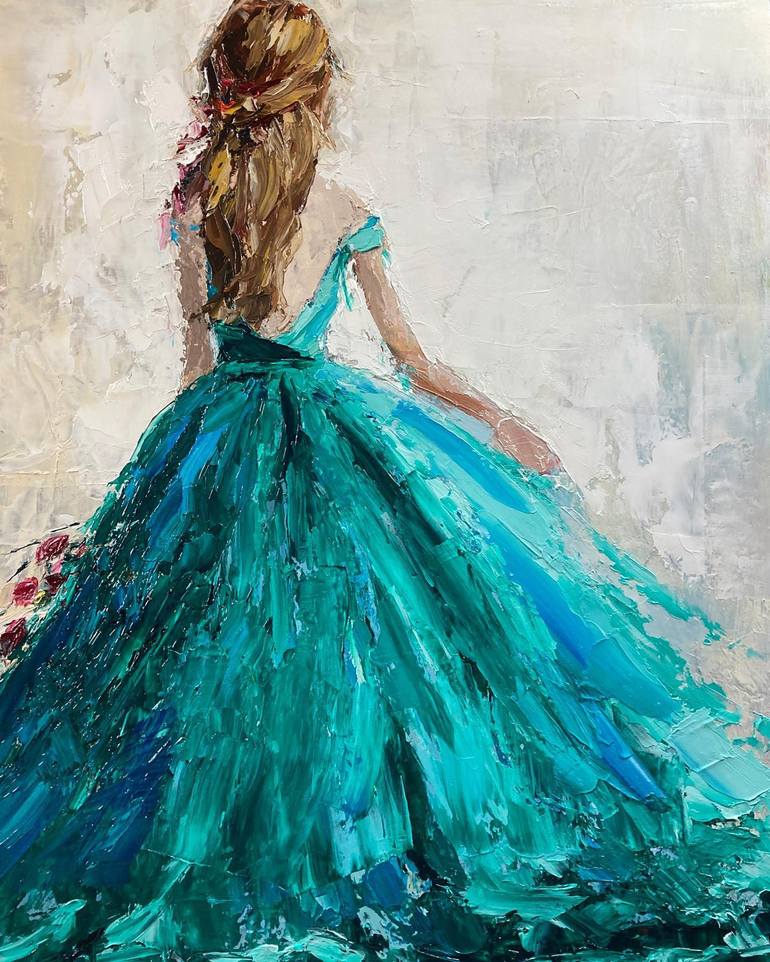 She's ready for the ball in her new teal gown. This painting was done with oil paints and a palette knife.