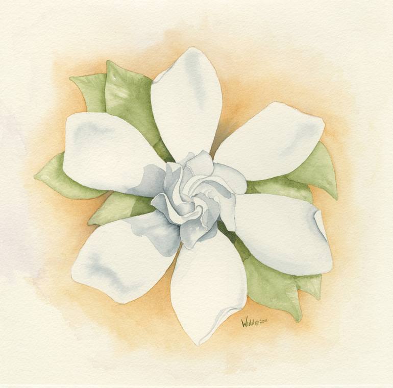 Graceful Symmetry was inspired by a Gardenia bush that is planted in my front yard. One day I happened upon a perfectly symmetrical bloom. I took some photos for reference and created this warm and inviting painting.