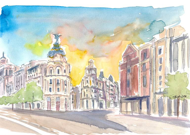 Gran Via Street Morning Scene In Madrid Spain Watercolor on Paper