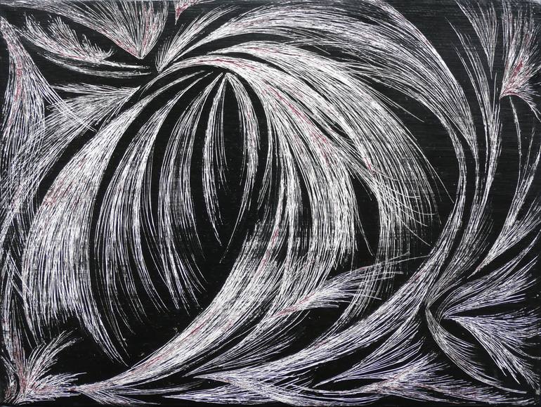 This artwork consists of several layers of acrylic on canvas which were scratched with an etching needle. Looking at the scratches you find traces of red and the white of the canvas under the black cover layer. It was New Year's Eve, I was alone and celebrated by scratching through the lacquer laye...