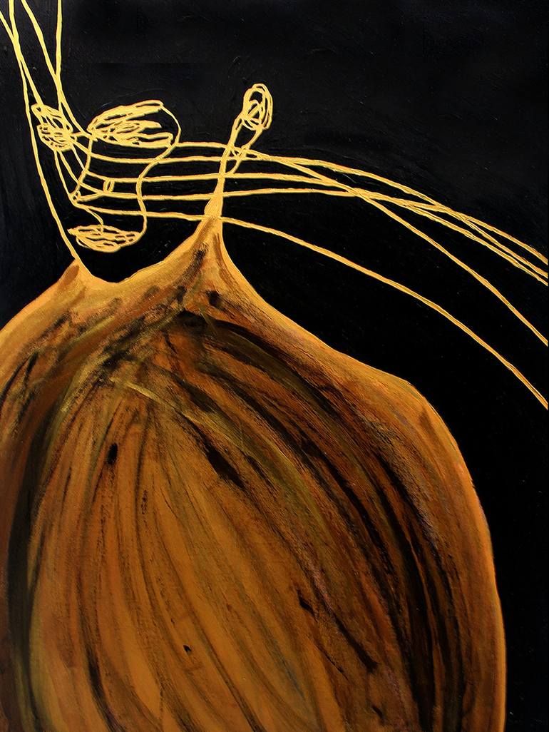 A fragile head crowned with threads — ideas, doubts, and memories — all suspended. Below it, the massive orb of being: the body, the emotion, the unconscious. The figure teeters between intellect and weight, as if thought alone could lift the burden of existence. “Gravity XII” speaks to the imbalan...