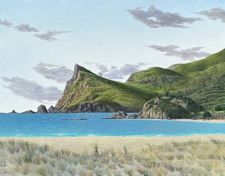 Justin Summerton was born in the Wirral , North West England, in 1968. In 1971 his family emigrated to New Zealand, where he lives presently. He completed a Bachelor of Commerce degree (1987) and a Bachelor of Arts degree (1993) at the University of Otago. In 1990, Summerton had a studio flat at St Clair Esplanade, Dunedin, where he experimented with oils, working mainly on seascapes. The following year, he had his first solo exhibition. Summerton is painter who depicts a dreamlike world in his work, often presenting New Zealand as a primeval landscape. In his work, Summerton reveals a fascination with New Zealand natural elements, such as the sea, volcanic cones, mountains and cloud formations, which constitute the basis of his work. His latest paintings have been described as inhabiting "a strange milieu halfway between representational landscape and surrealist dreamscape." The artist makes the landscapes his own, by rearranging and/or adapting them to his vision, obeying to symbolic or allegorical purposes. The surrealist painter favours a utopian New Zealand: "Most of my art is related to the ecology of the world," Summerton says. "I'm not a hippy, greenie painter who rants on, but maybe I am an environmentalist. New Zealand is a bit of an oasis like that and I've had that theme running through my work for a while." "Summerton’s works harness the raw energy of New Zealand landforms and coast lines through the texture of his paint. He captures and intensifies this power with layers upon layers of dense oils, culminating in a landscape that is far from traditional, and so referring to New Zealand landscape with a fresh perspective." At a recent solo show of his paintings, his technique was described as "scrumbling", a "brushstroke technique to build layers of colour and texture onto the canvas surface. This approach tends to modify rather than obscure the previous layer and creates stark contrast between dark and light pigments. The overall result is a fresh and vibrant new view of the New Zealand landscape." According to Warwick Henderson Gallery administrator Pania Lincoln, "his intensive application of oils builds layers of colour and texture that give the works a visual and literal 3-dimentional [sic] quality that is unique." Justin feels a particular affinity with the New Zealand coastline and beaches, spending much of his time in the water as a passionate surfer.