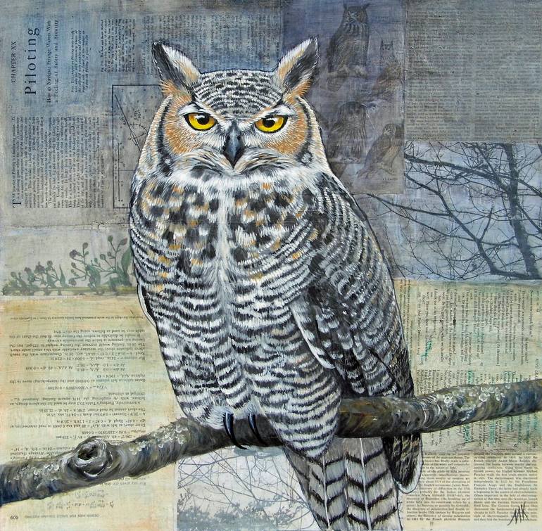 Detailed illustration of great horned owl in the tradition of Audubon. A collage of antique book pages and maps forms the abstract night sky background. Acrylic, gouache and found paper collage on cradled birch plywood, wired and ready to hang.