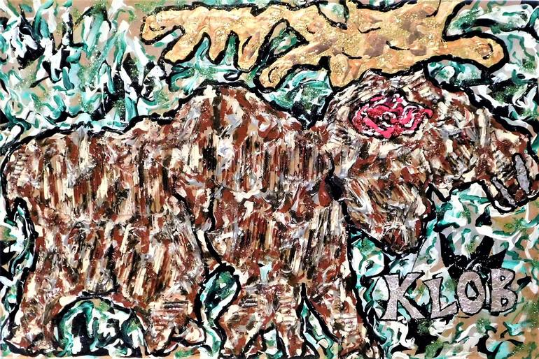Great Northern Moose - 2022 Crude figurative, hyper-cartoon, moveable street, surreal, expressionistic, pop industrial, animated rendition of a Great Northern Moose With Golden Antler One of Last, Great, Mega Fauna of Northern Climes Lurking amongst the undergrowth of the Flora in the Hinterlands