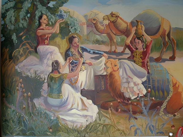 Goods of great silk road. History painting of different goods