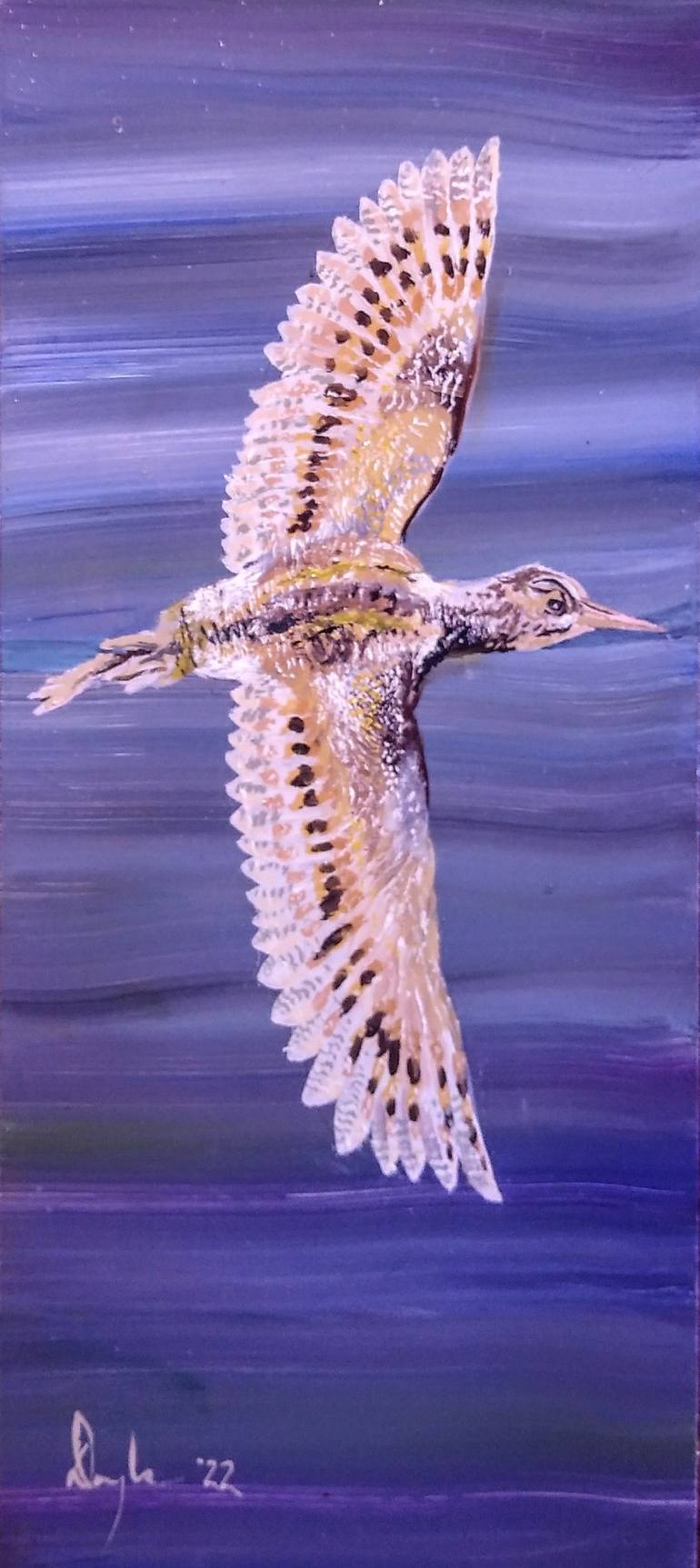 The Greater Painted Snipe is a marvelous creature which is best seen "on the wing". I've painted many birds sitting on twigs, a static scene behind them, but this painting required the feel of speed. So the background on a blurry whoosh speeding by. Oil on hardboard and sealed properly with varni...