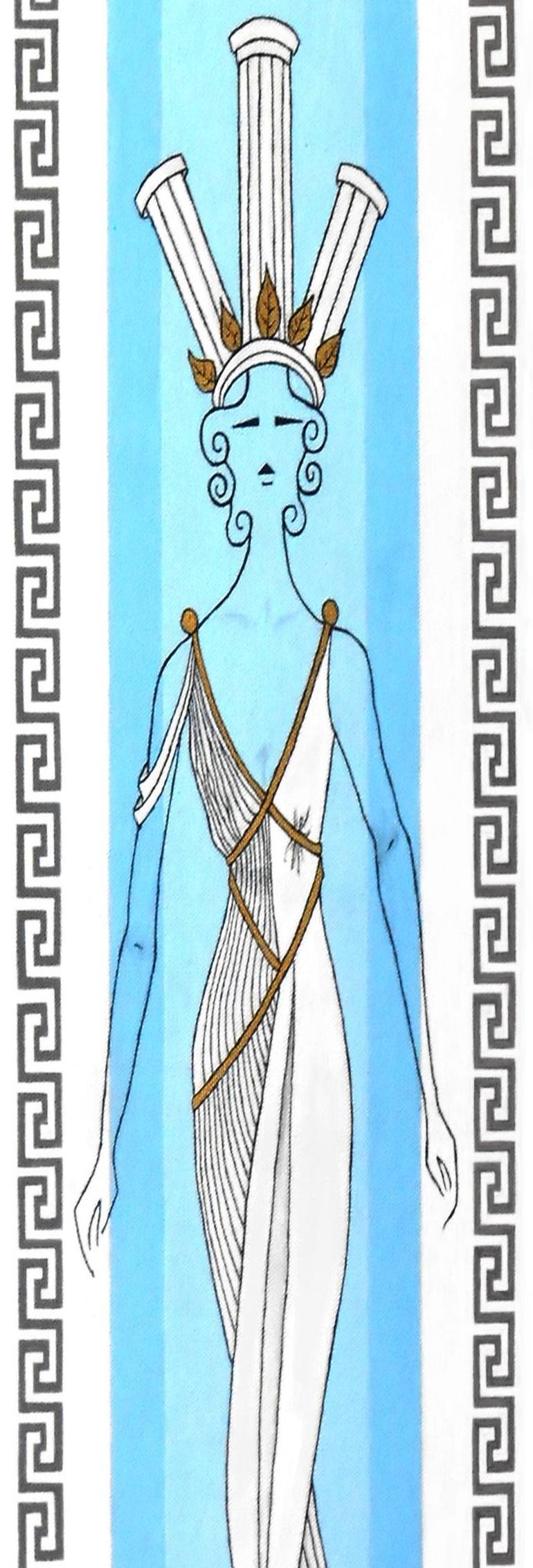 This semi-abstract elongated female figure, in her beautiful white gown with metallic gold trim and her imposing headpiece of Doric pillars, is the archetype Greek goddess. The background consists of blue and white stripes, the colors that personify the Greek islands--its flag, its architecture, and...