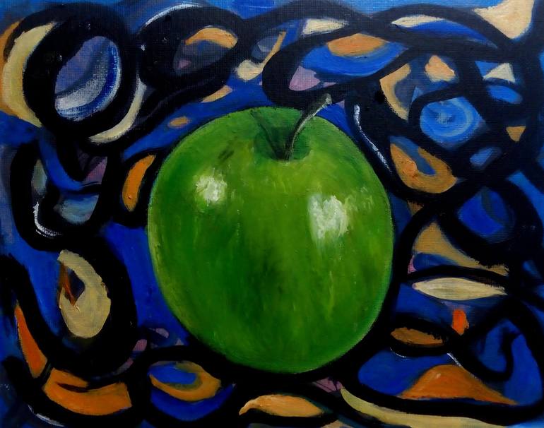 I enjoy depicting fruit in my paintings. I painted a realistic apple against an abstract background of black lines and spaces. The two elements of the painting contrast and juxtapose each other to produce a stunning work of intense colour and line.