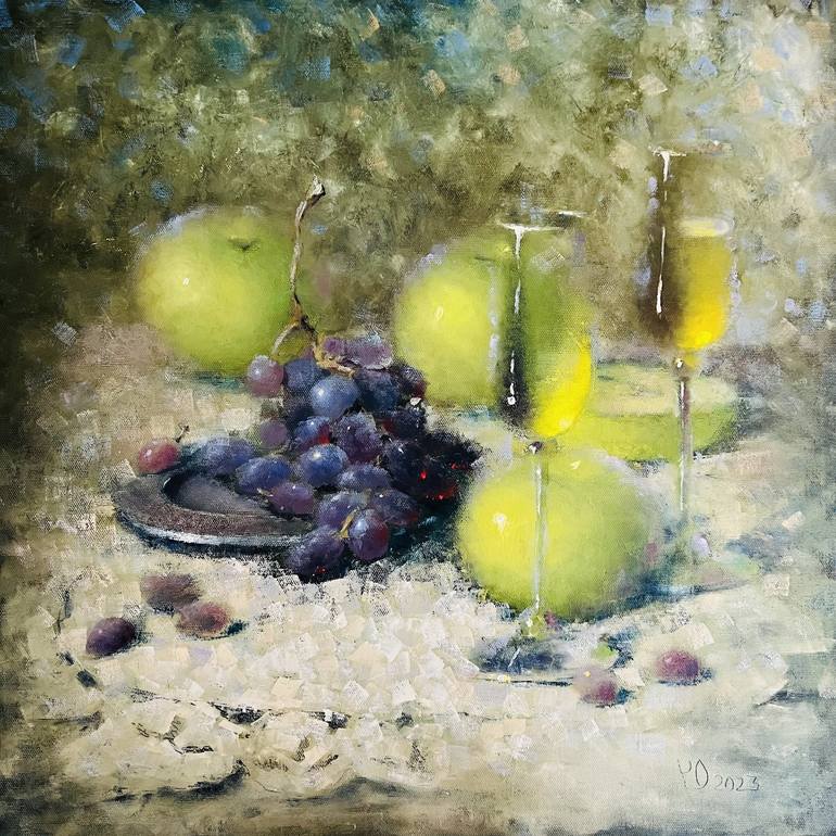 This original still life oil painting features a serene composition of green apples, deep purple grapes, and elegant champagne glasses, arranged on a softly textured lace cloth. The harmonious interplay of natural tones evokes a peaceful, timeless ambiance. The palette blends olive green, emerald,...