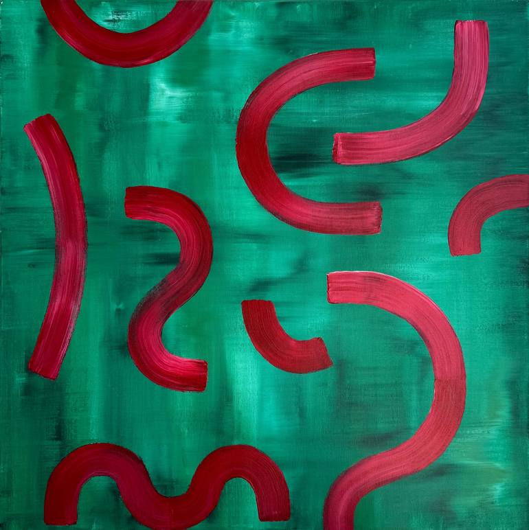 Bring bold energy to your space with this Memphis-style abstract painting, a striking acrylic artwork. Part of a four-piece collection, this piece features curving, squiggle-like forms in deep red, set against a rich green background with subtle tonal variations. The combination of smooth color tran...