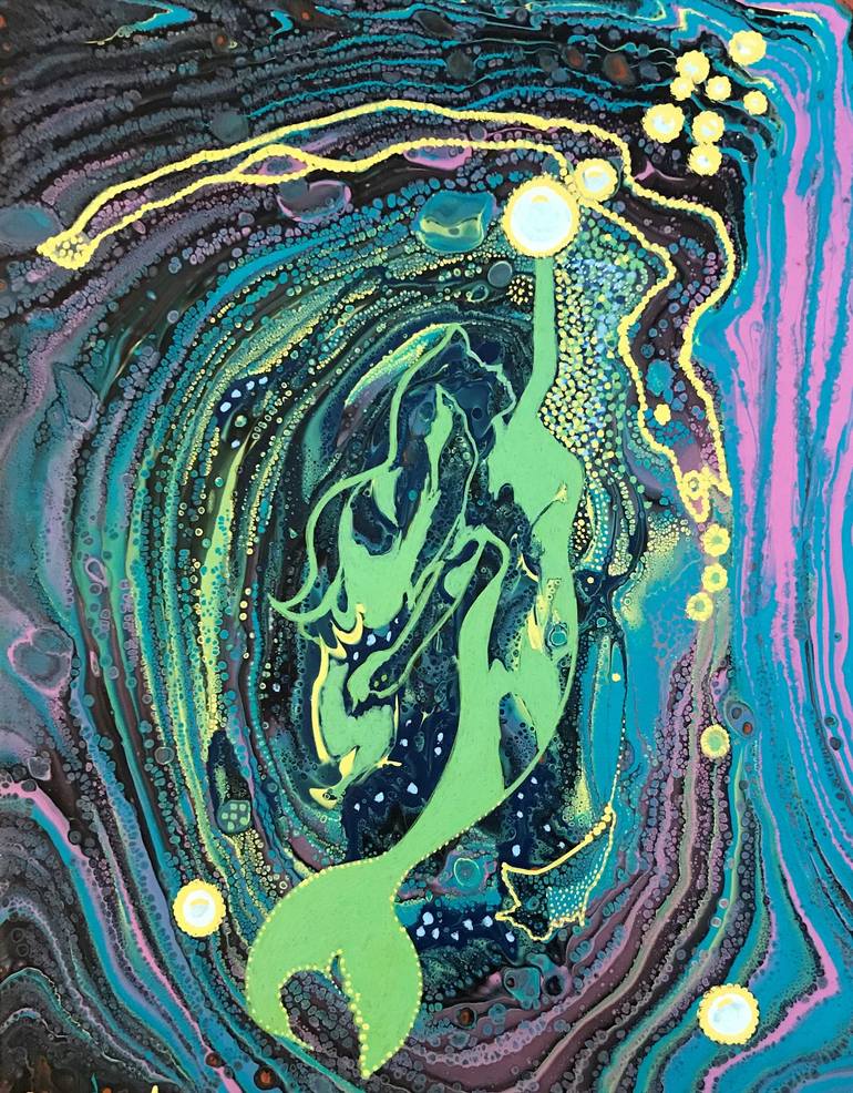 I am fascinated by mythical creature. An aquatic creature with the head and upper body of female human and a tail of a fish. In this painting i created a beautiful Mermaid swimming from the bottom of the ocean towards the surface and you see the beautiful bubbles forming around her. She is playing w...