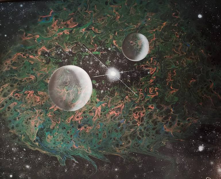 Title: Cosmic Fusion Size: 20 x 16 inches Medium: Acrylic on canvas, sealed with lacquer spray Cosmic Fusion explores the boundless mysteries of outer space through a vivid interplay of green, orange, and cosmic elements. Planets and stars drift through the imagined galaxy, where color and light me...
