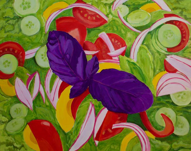 Green Salad has the colors and vegetables of a green lettuce salad adding red onions, peppers, tomatoes,cucumbers and a rarely seen opal basil leaves. What makes it unique is the oversized proportions and flattening the picture plane when seeing it from directly above.