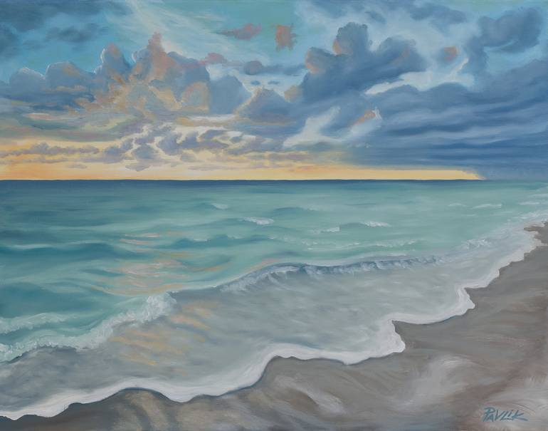 This painting is really about the way the waves softly flow into the sand. The water here on the Florida's gulf coast is very calm and very shallow. The waves hit the beach so gently and recede so slowly. And as always, I try to capture the incredible colors in the sky and interesting cloud formatio...