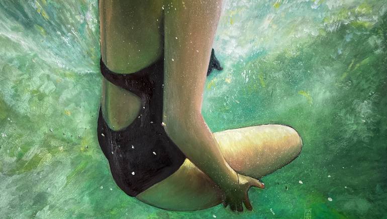 I like to paint the human figure in non-obvious contexts, and this image of a friend underwater made me want to paint her. The real colors were less bright and I preferred bright green. I liked to deepen the sense of depth one gets when looking underwater. An unlimited horizon in which one floats. I...
