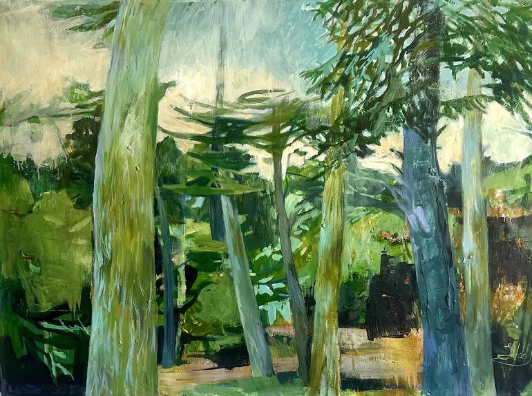 Immerse yourself in the tranquil beauty of nature with "Green Magic," Julia Hacker’s latest contemporary landscape painting. This evocative piece captures the serene essence of a lush forest, where towering trees stretch toward the sky, their textured trunks bathed in hues of emerald, deep blue, and...