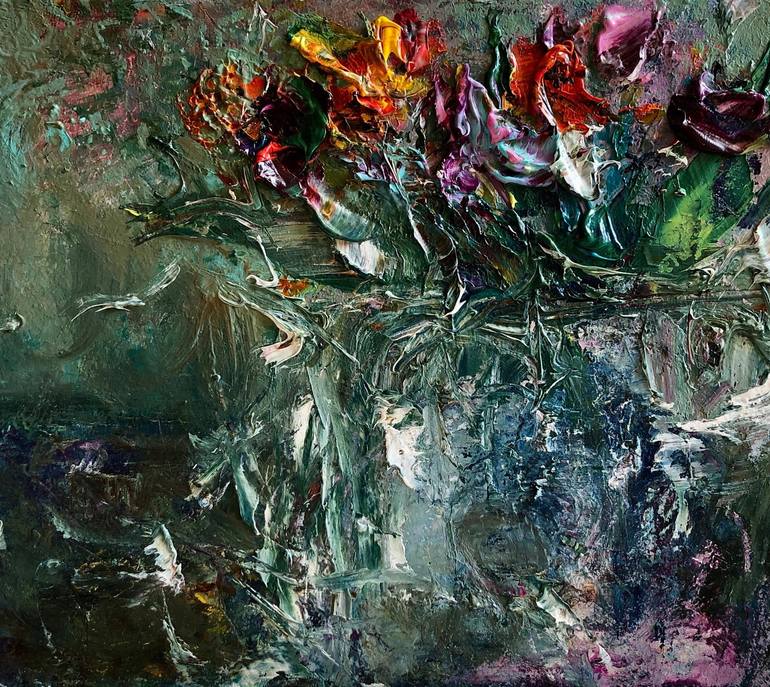 Texture floral artwork. Original painting with professional oil paints. Modern miniature using impasto technique. Wild flowers and plants in all their splendor. You will be surprised by the unique drawing style. Green still life. This work of art will take its rightful place in your collection or wi...