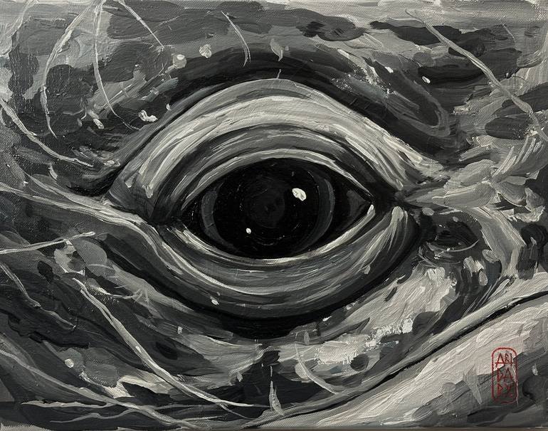An intimate portrayal of the grey whale's eye, this acrylic painting on canvas captures the essence of marine life's mystery and beauty. The detailed brushwork reflects the soulfulness of the ocean's majestic creatures, blending contemporary artistry with nature's raw elegance.