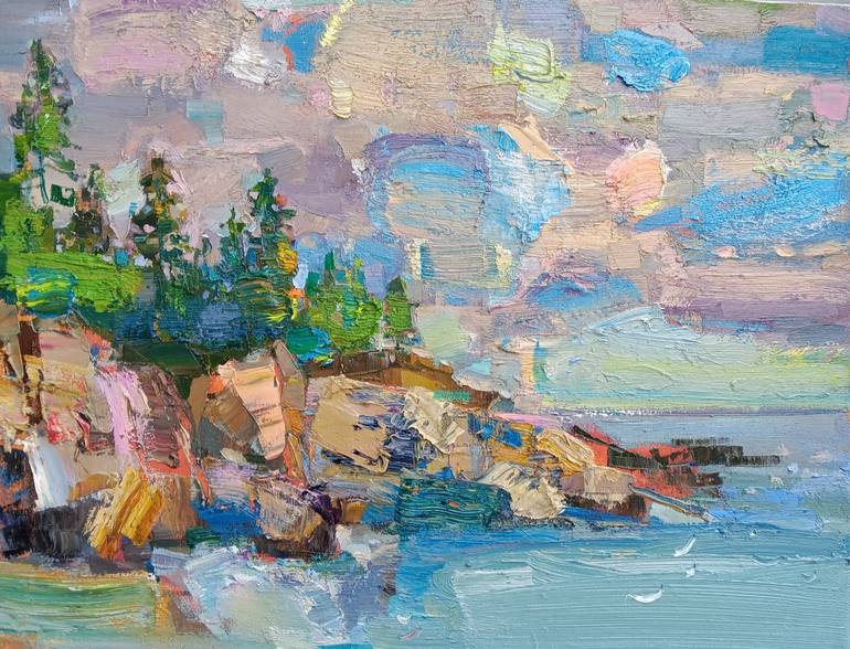 Original oil and acrylic on canvas landscape painting stretched on a wooden frame. Impressionist etude of New England coastal line. Rocks and pine trees over the ocean. Cloudy day in blue and grey colors. A plain air atmospheric study was finished in the studio. Impressionism. Impasto. The artwork...