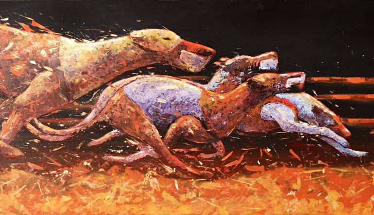 Acrylic painting on wood panel of a greyhound race. What inspires me in this artwork is the power of color joined together with the strong scene of these greyhounds struggling for the victory. If you like to see further pictures close ups and details of the masterpiece, please write to .