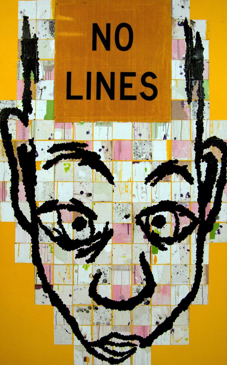 Large collage based painting, with road sign attached. For more information: