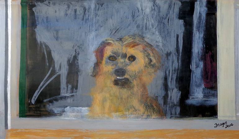 Lonely dog spends the day at the window watching the street.