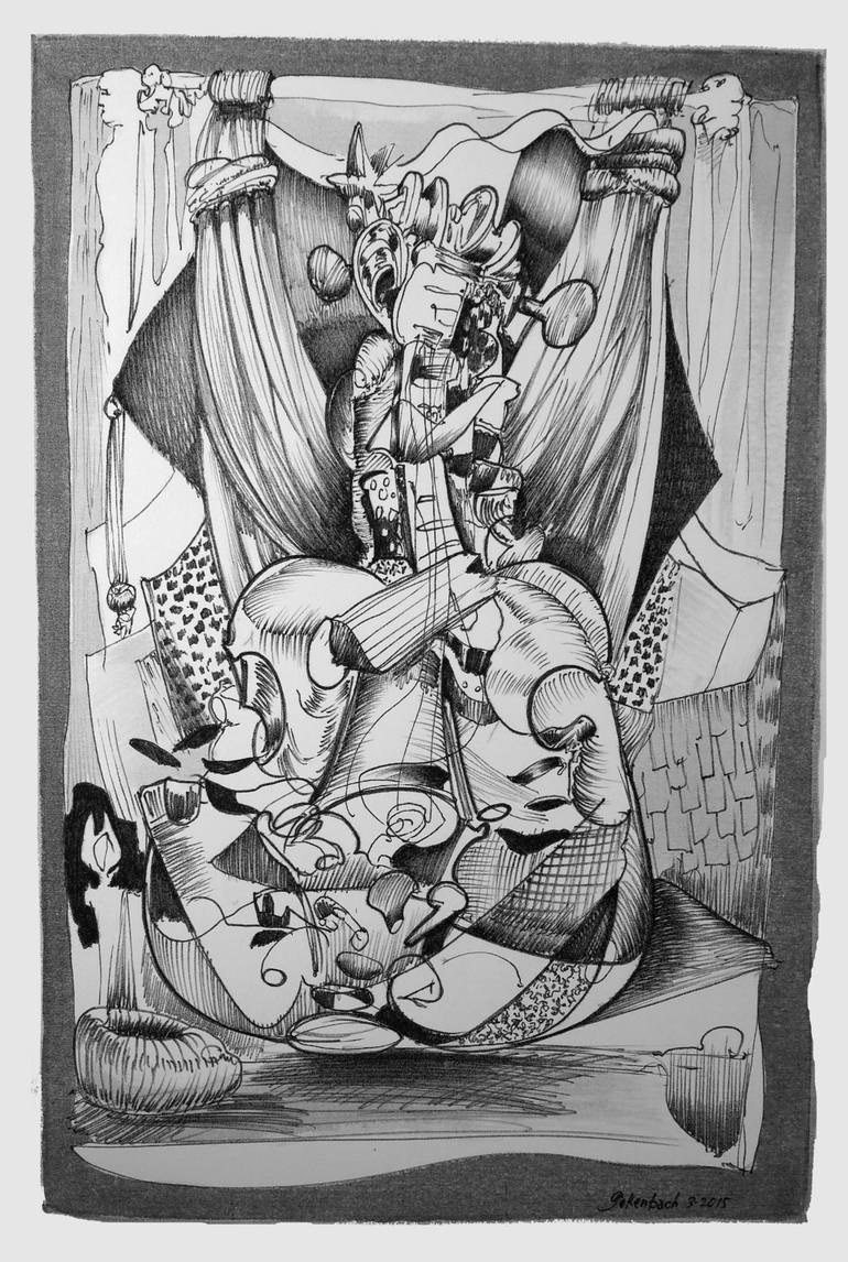 Staying at a hotel in Disney World, I started drawing this piece and a series of others loosely based on some of the architecture I saw. That, coupled with my long time interest in guitars and various other stringed instruments, were the inspiration.