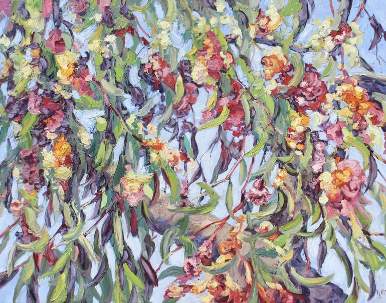 An original 22" x 28" or 55.88cm x 71.12cm, Gum Tree oil painting on canvas. This light and airy scene gives the viewer the feeling of looking up into the trees at a beautiful clear blue sky. The eucalyptus flowers are in full bloom and the leaves appear to be blowing slightly in the wind. This pain...
