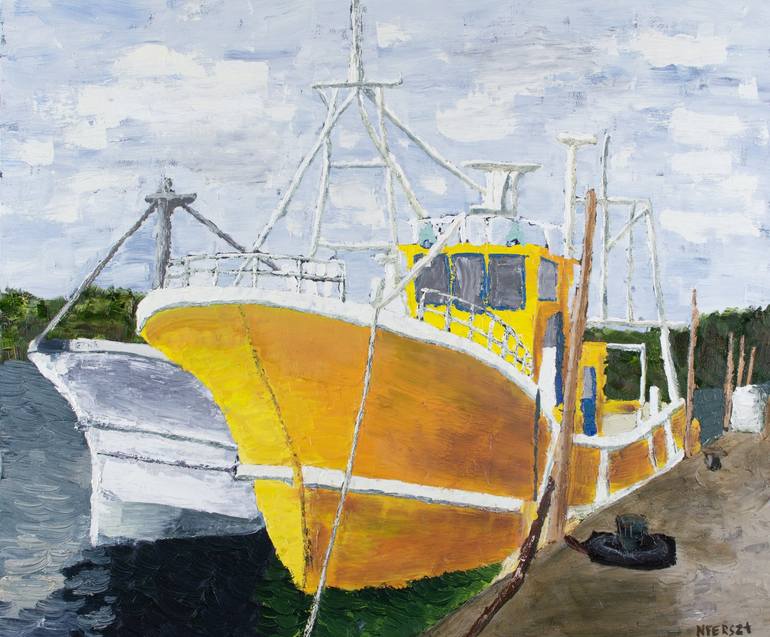 Japanese fishing vessel docked in the harbor. Bright yellow makes it stand out next to it's dull grey white neighbor behind.