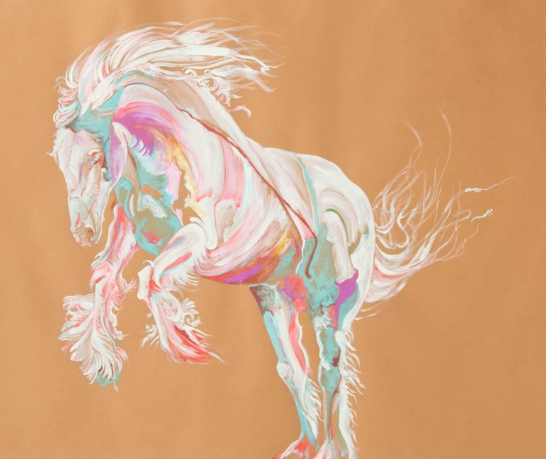 A beautiful painting of a 6 year old cob about to rear on a soft caramel background. The horse is mainly in white with turquoise and magenta pink detailing. The tail and maine flare out to add to the movement of the horse showing his vivacious mood.
