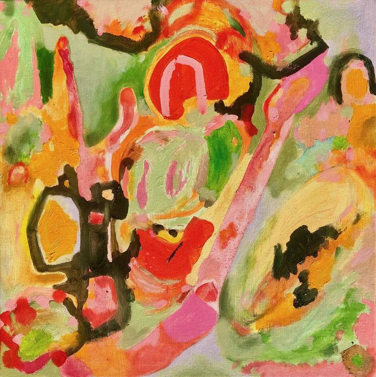 Organic abstraction that moves between primitivism and graffiti where dark strokes are configured as signs of an indecipherable code on a vibrant and playful background.
