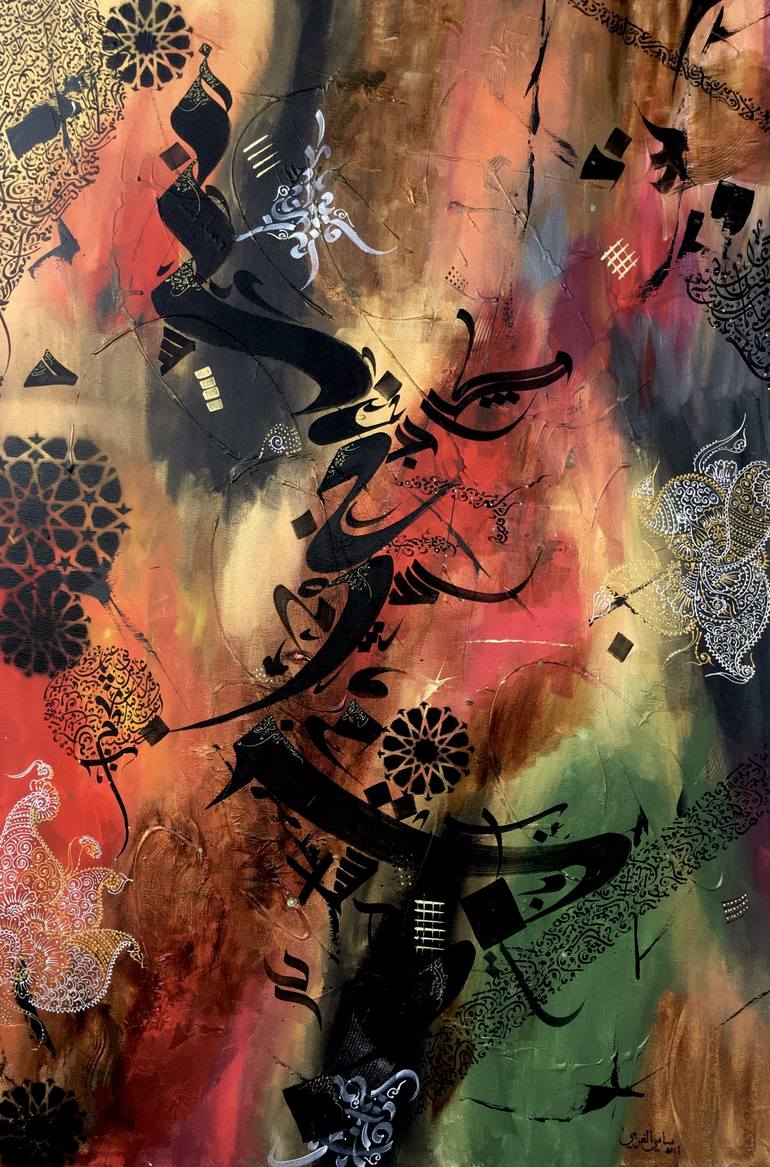 Acrylic , spray paint, permanent marker and ink gel pen on canvas 80x120cm In this artwork I used 2 styles of Arabic calligraphy (free style, Kairouanais ) Abstract Arabic calligraphy (random letters, no literary meanings), I used arabic letters as artistic tools to make this abstract artwork Arab...