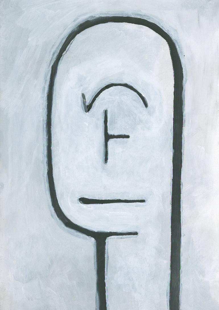 A single charcoal-black contour rises through a mist of grey, bends into an almost questioning curve, then drops—half glyph, half lopsided antenna. The image was not drawn in one gesture but coaxed from numerous alternating layers of white and black acrylic, each coat partially veiling the last unti...