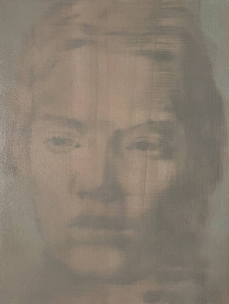 Portrait of a young woman. Painted with cold grey. Used wide brush technic. Oil on canvas. Ships in a crate.