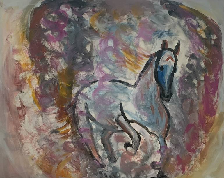 This painting was inspired by the movie, "Twisters", specifically the scene where the rodeo horses flee the tornado. Canvas stretched on wood. The sides are painted magenta.
