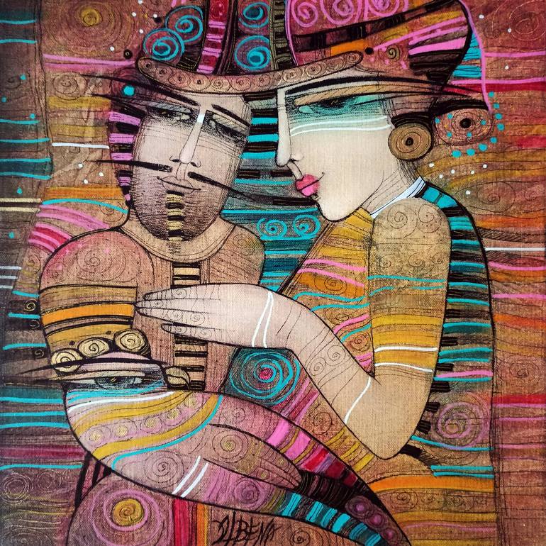 This is a work painted in oil on linen canvas with several successive layers, oil pastels, outlines in black Indian ink. Effects with gold metallic oil paint. Touch-up varnish. Black ribbon on the edges; wooden frame. My work is all about capturing love, tenderness and beauty in life. My favorite m...
