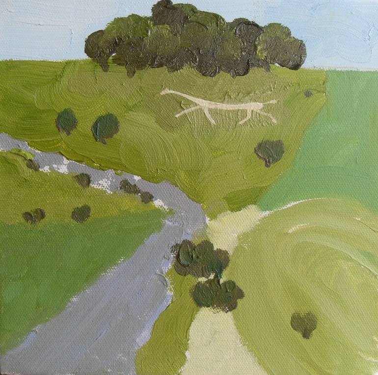 A small landscape in oils on a box canvas, which can either be framed or hung as it is, or will freestand on a shelf etc. This is one of the thirteen white horses cut into the chalk hills on the Wiltshire Downs; this one is at Hackpen near Swindon. This horse is about 150 years old; some are much ol...