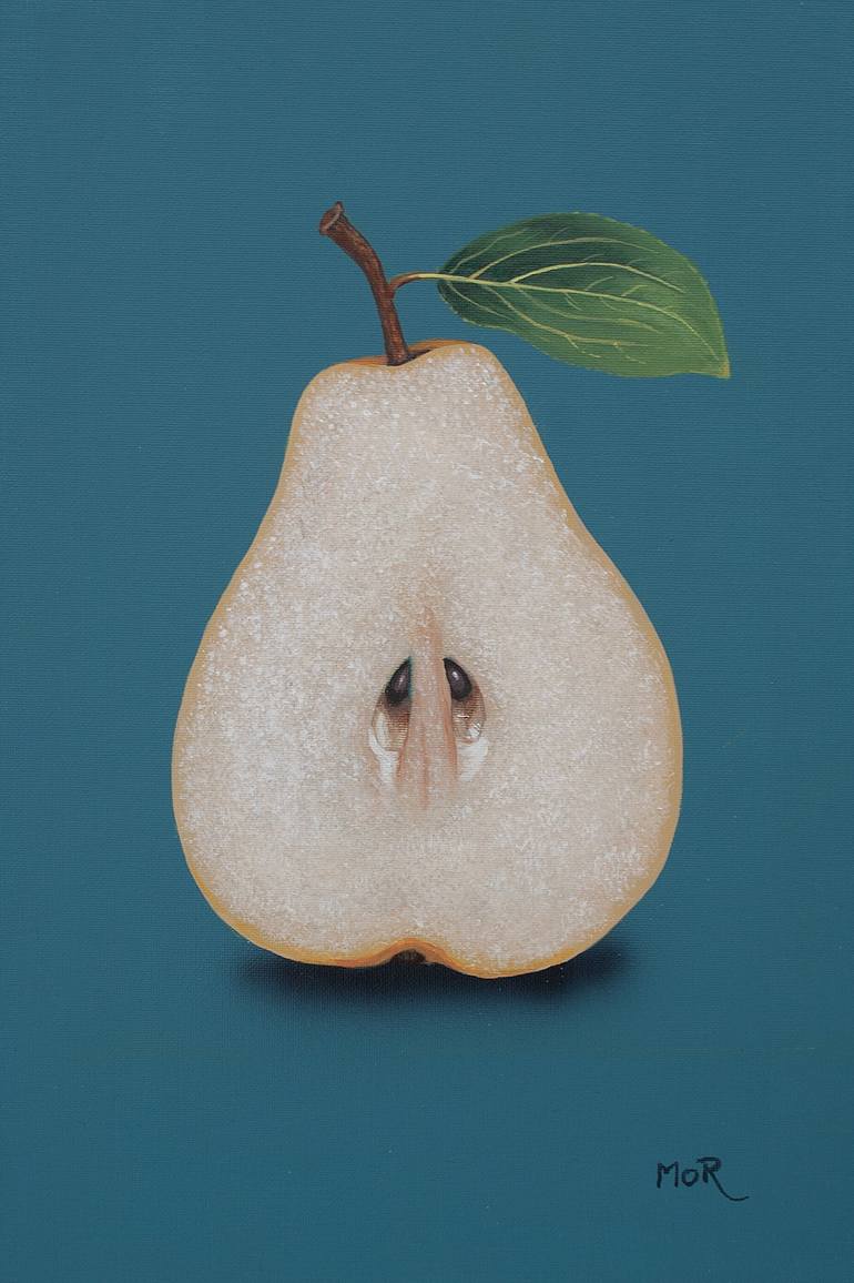 A pear cut in half showing the core. For us humans, the juicy sweet flesh is the most important thing. But the carelessly discarded core contains the pear's most precious treasure - the seeds, which are supposed to guarantee the survival of the species. The background is deliberately monochromatic a...