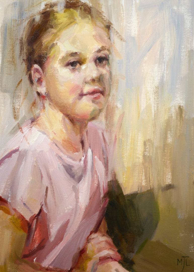 Portrait of a young girl in oil on canvas. I aim to engage the viewer by suggesting features rather than rendering them in great detail.