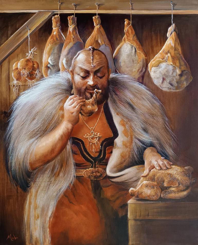 Figurative expressionism to savor the intensity of sensory pleasures. This portrait reveals the indulgence, texture and brilliance of lavish living, recalling the opulent feasts and delights of the world. Oil painting on linen canvas stretched on a frame. Wooden frame.