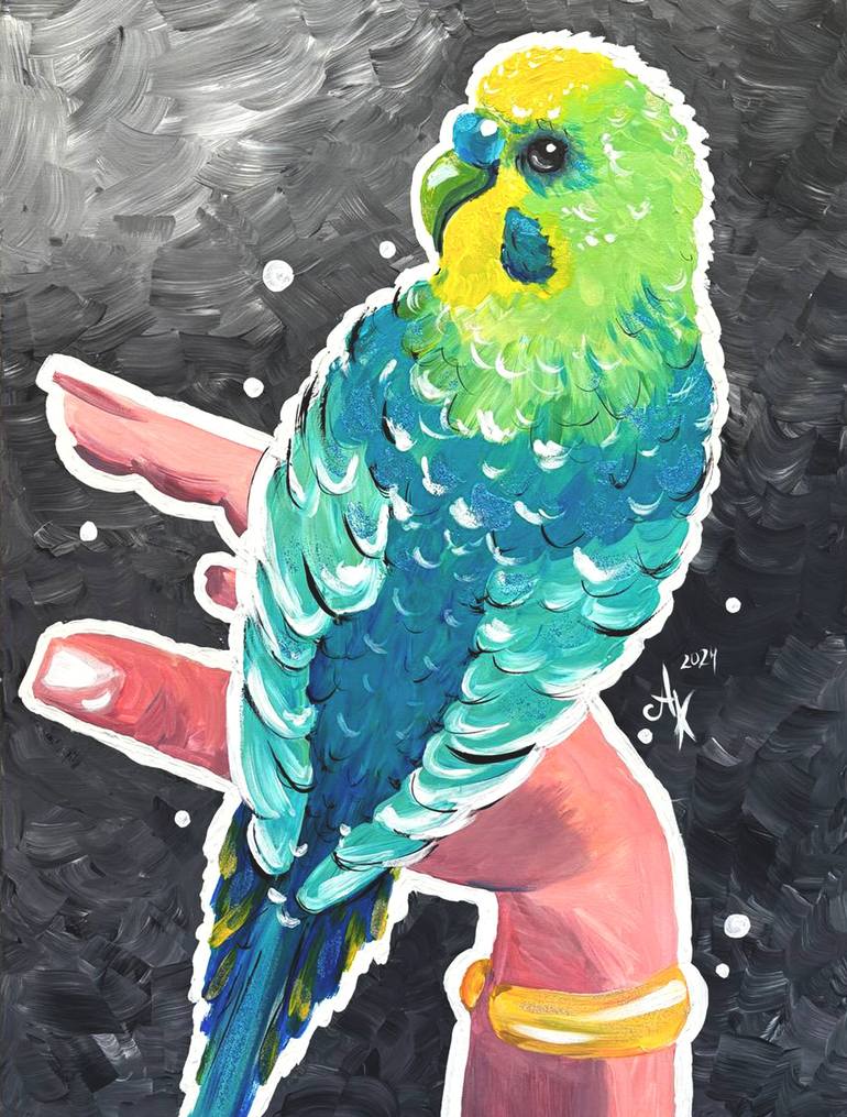 Awaken your imagination with this magical artwork! 🎨✨ This original acrylic and glitter painting features a vibrant green and blue parakeet perched on a hand, shimmering beautifully against a deep black background. Inspired by the whimsical style of Bill Carman, this unique piece is full of rich d...