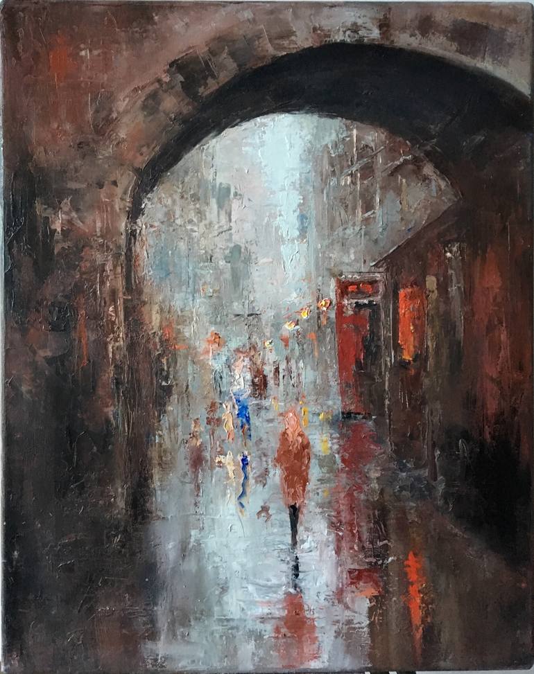 Prague is the very nice city. Once, after a light rain, I saw this passage and decided to transfer it to the canvas.